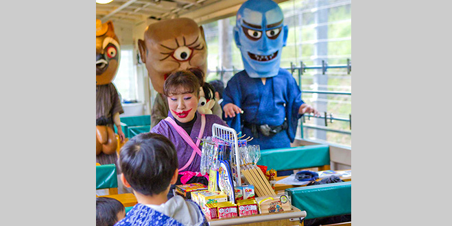 大歩危に伝わる妖怪伝説にちなみ、阿波池田駅~大歩危駅間では夕刻の時間帯に「大歩危妖怪トロッコ号」を運行。3体の妖怪たちが列車に乗り込んで、一緒にトロッコの旅を楽しめる。どんな妖怪に出会えるかは、当日乗車してからのお楽しみ。