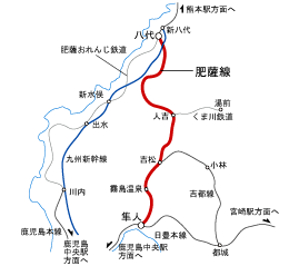 鹿児島本線八代駅から分かれ、人吉駅、吉松駅を経て、日豊本線隼人駅に至る営業キロ124.2kmの非電化・単線の路線。明治36年(1903)9月に、国分駅(現・隼人駅)~吉松駅間が開通、同41年11月には八代駅~人吉駅間が開通した。最後に残った人吉駅~吉松駅間は、急勾配を緩和するためにループ線などを設け、翌42年11月に開通した。当時は、このルートが門司駅(現・門司港駅)~鹿児島駅を結ぶ鹿児島本線だった。その後、昭和2年(1927)10月に川内(せんだい)駅を経由するルートが開通し、肥薩線となった。