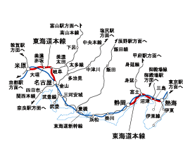 沼津駅を発車して町並みを走り抜け、原駅、東田子の浦駅と進むと、車窓右には富士山の美しい姿が望める。製紙工場が建ち並ぶ中を行くと吉原駅。次の富士駅を発車すると、まもなく列車は富士川に架かる橋梁を渡る。車窓右後方になるが、車窓いっぱいに広がる富士山と富士川のコラボレーションは、息をのむような眺めだ。
