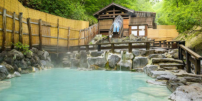 蔵王温泉は硫黄臭のする酸性の湯。蔵王連峰の標高900mにある日帰り入浴施設「大露天風呂」で、美肌の湯と名高い青白い湯と、山景色を堪能しよう。冬季は閉鎖。