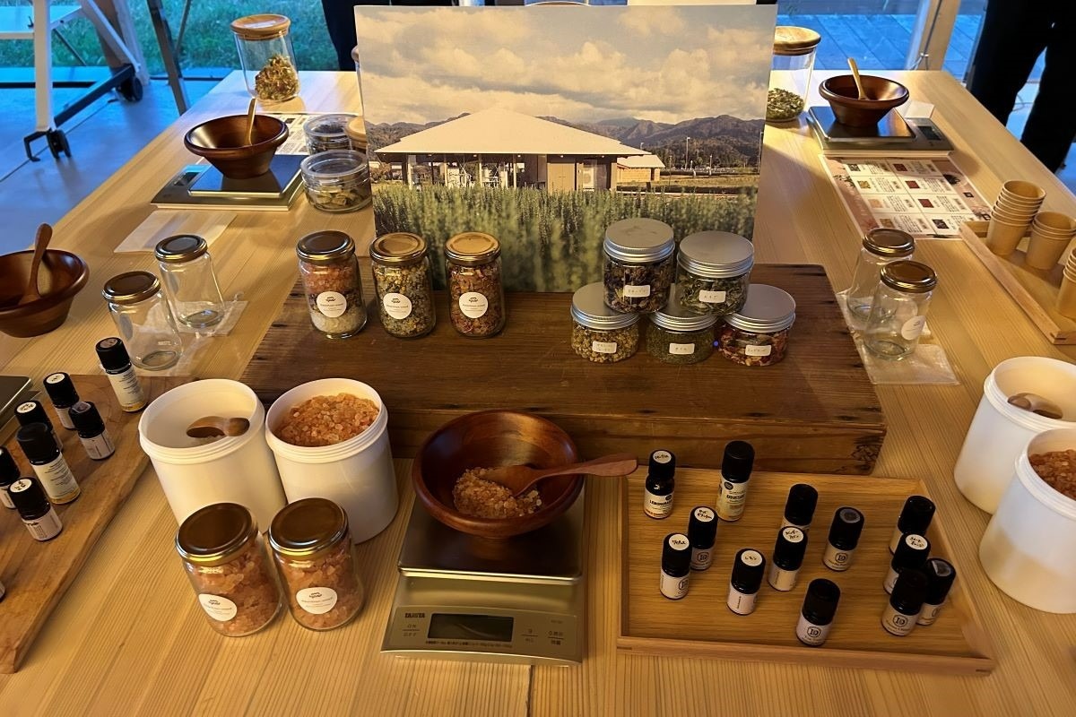 アロマ工房では、ハーブやアロマの専門知識を持つスタッフからハーブの特徴や効能について学び、自分だけのブレンドハーブティーやバスソルトをつくることができます。