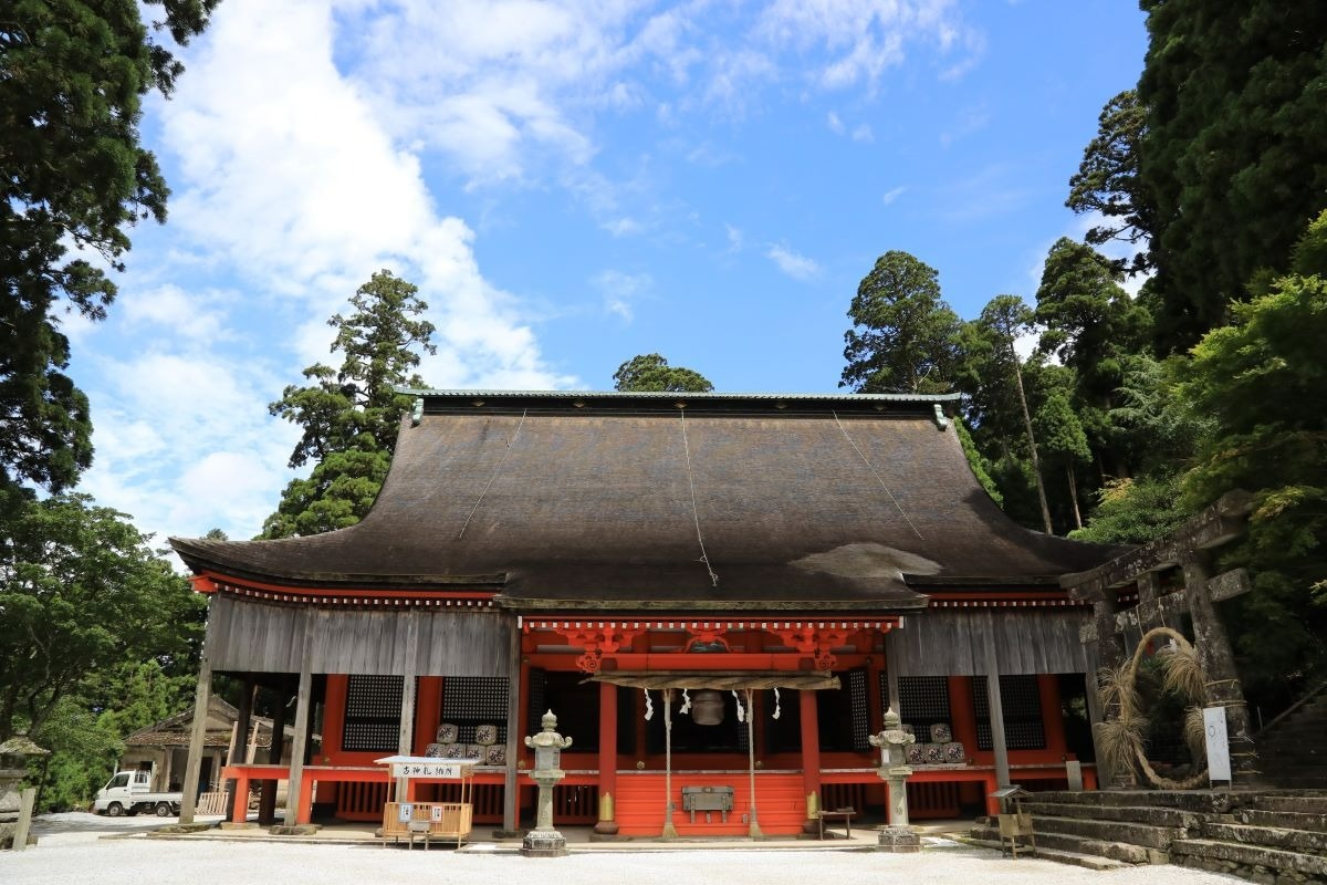 英彦山神宮奉幣殿(ほうへいでん)。右の鳥居から登山道へ