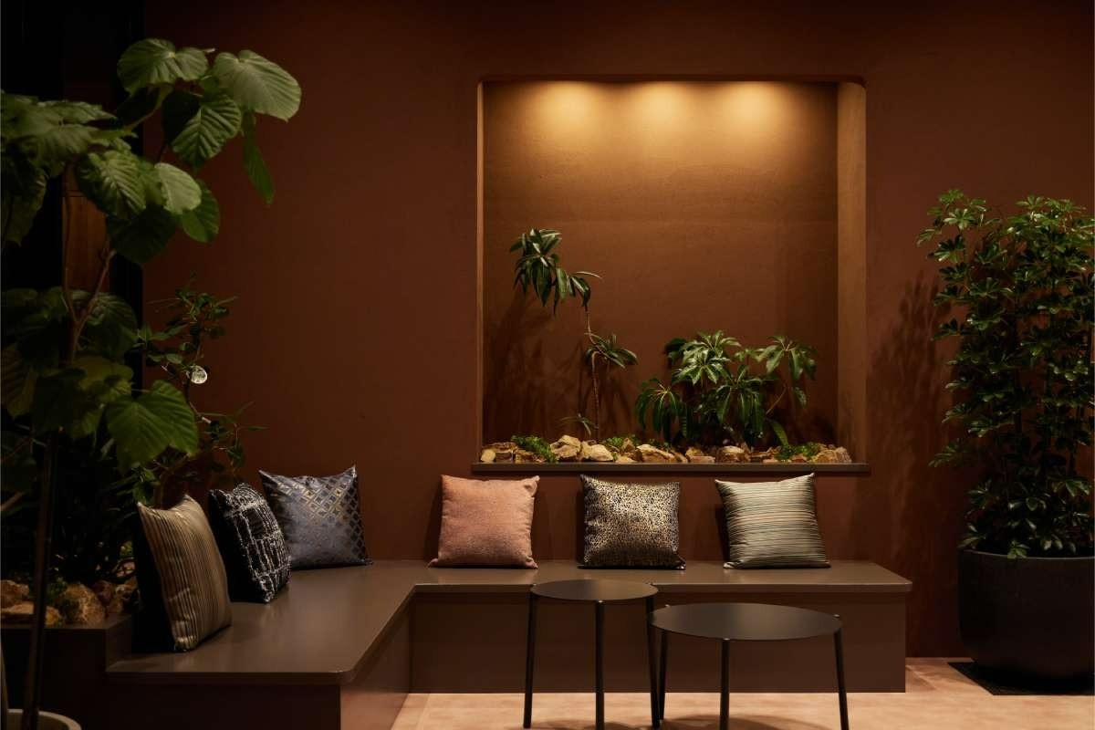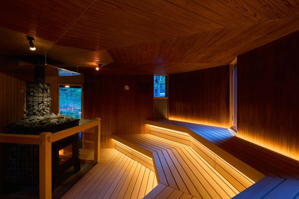 サウナ室のベンチは会話が生まれやすい角度をつけた設計