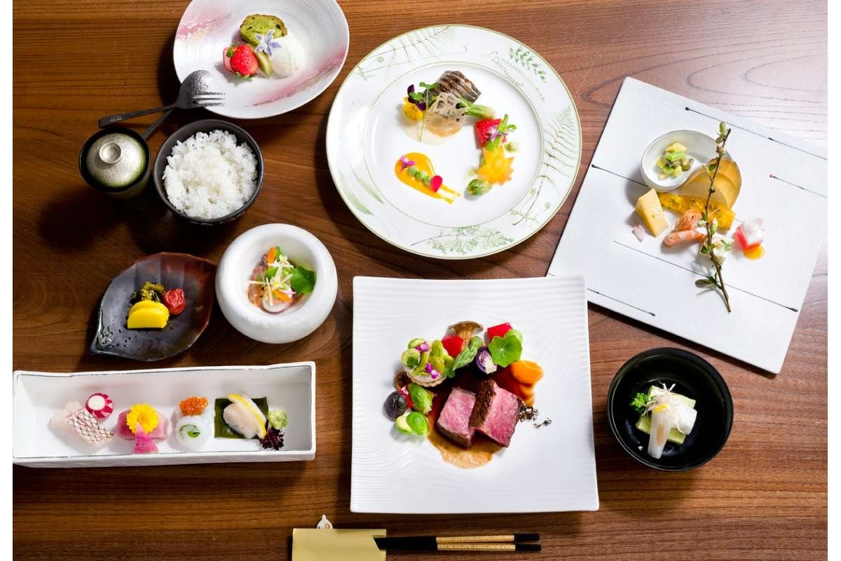 地元産の食材を中心に、佐賀県産黒毛和牛も付いた8品の和洋会席を(スタンダードプラン。10月~メイン料理はしゃぶしゃぶやすき焼きなど)
