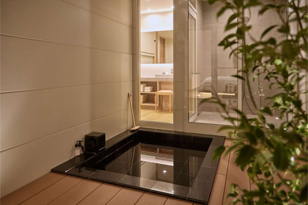 客室には御影石の露天風呂が。檜風呂の部屋もあり