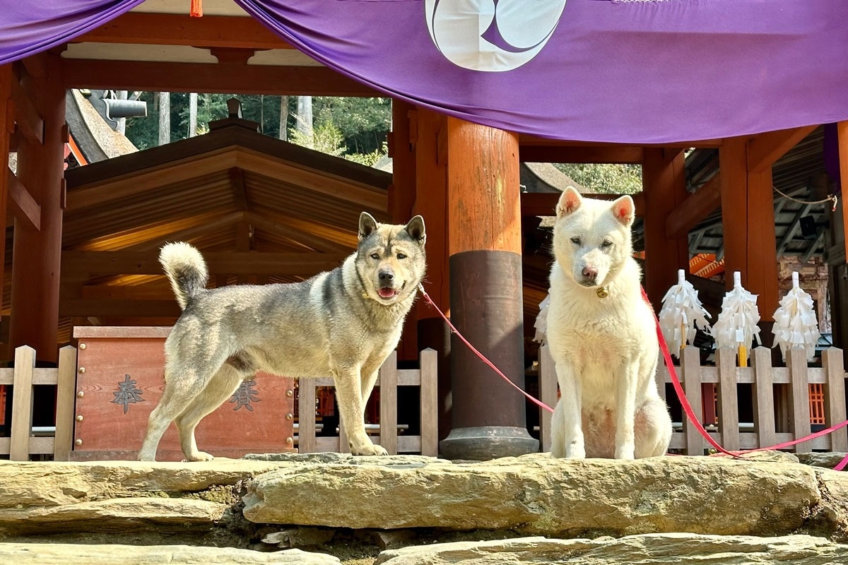 ご神犬すずひめ(白)、大輝(黒)(丹生都比売神社提供)