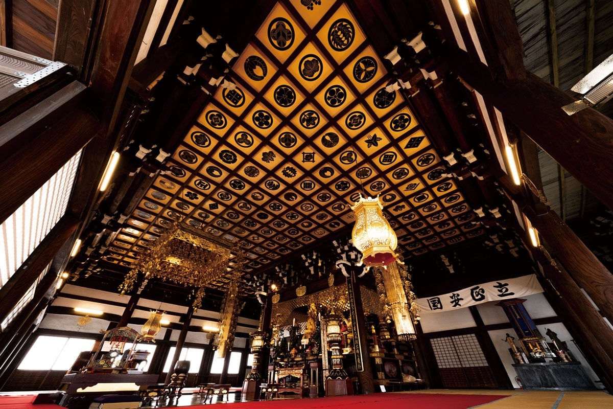 京都における初の日蓮宗寺院として知られ、巨大な大本堂には日蓮大菩薩をはじめとした4尊像を祀る。豊臣秀吉など数々の戦国武将たちが定宿にし、秀吉により現在地に移転。四季折々で趣の異なる4つの庭園も美しい。