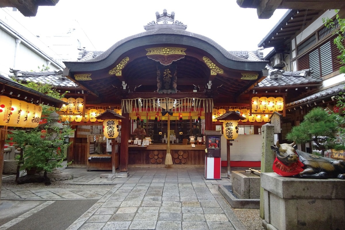 錦市場のにぎわいの先、新京極商店街に面して佇む錦天満宮は、学問の神様・菅原道真を祀る神社。こぢんまりとした境内ながら、「撫で牛」や「大願梅(たいがんうめ)」などがあり、境内の井戸からは名水「錦の水」がこんこんと湧く。