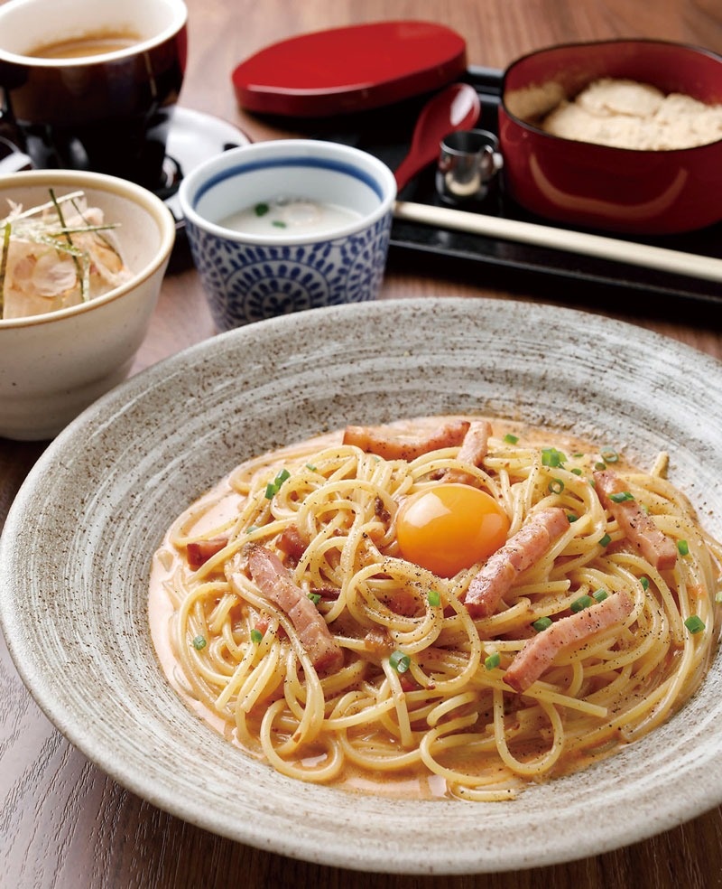 和の器に盛られた創作和パスタは、人気の「めんたいこカルボナーラ」から、「京生麩とエビの山椒マヨネーズ」といった変わり種まで、素材を活かした多彩なラインアップ。パスタやドリンクを選べるセットメニューがお得。
