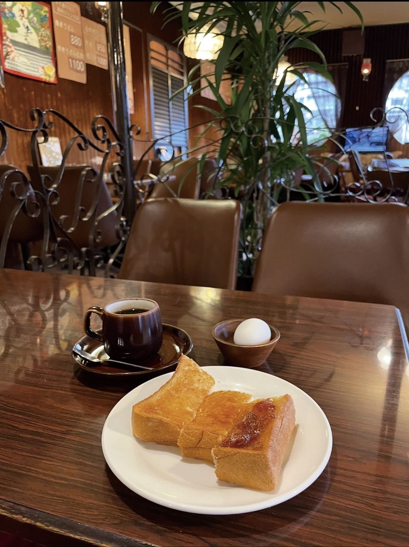 フランスの田舎家をイメージしたレトロな喫茶店。丸窓や布張りの壁が懐かしさを誘う店内で、朝から夕方まで6種のモーニングを提供する。店主の「家のようにくつろいでほしい」という思いが、空間やメニューににじむ。