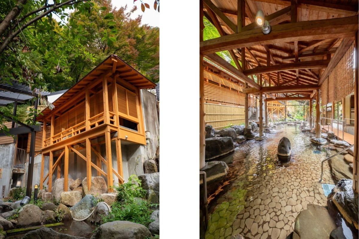 レトロな雰囲気の右の湯は、創業時から残る庭園を中心に2019年改修