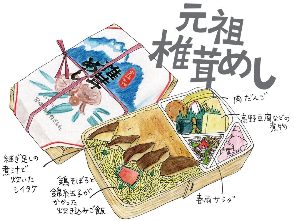 1953(昭和28)年発売のロングセラー駅弁。宮崎の山の幸・椎茸の駅弁です。