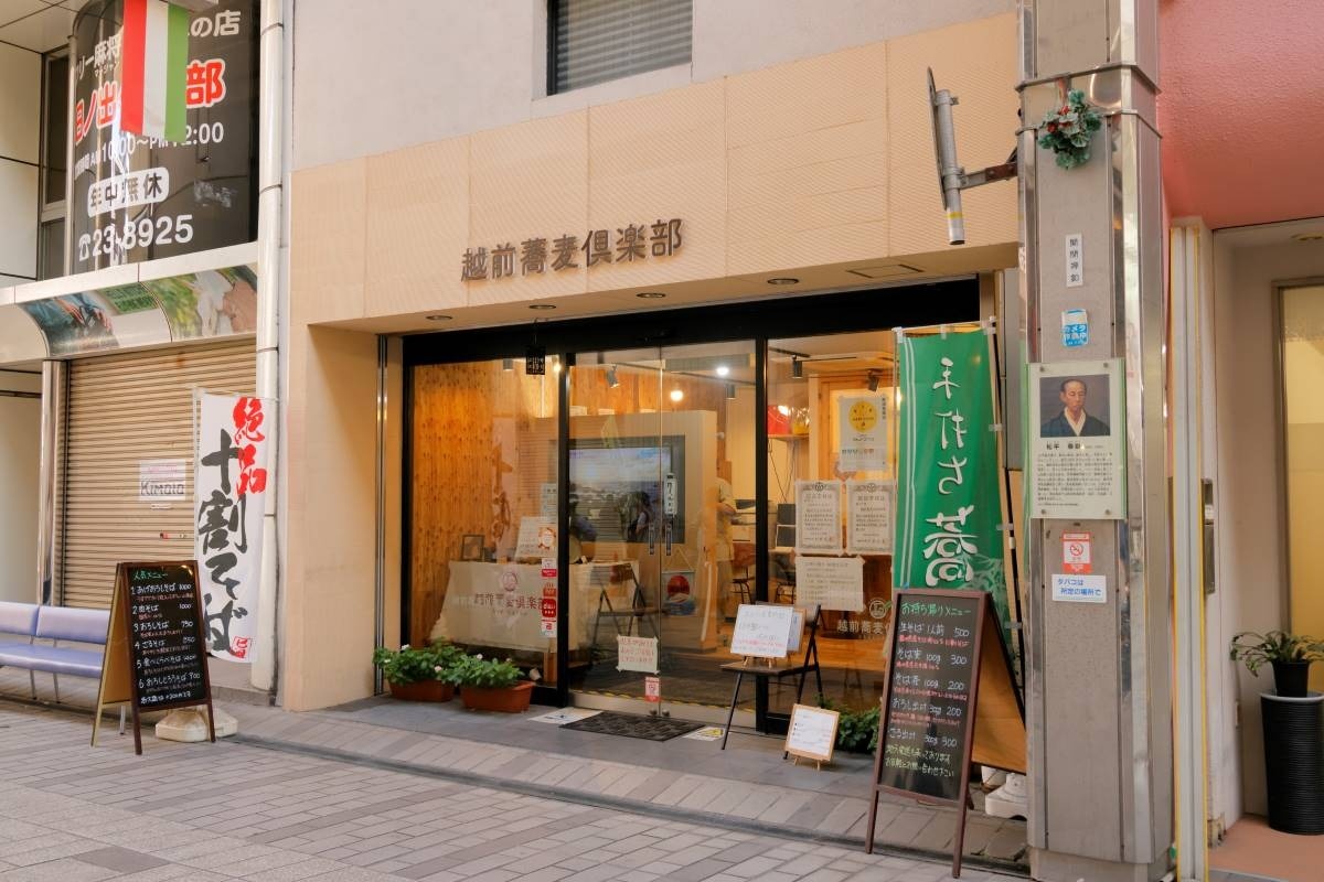 福井県産在来種を100%使用し、つゆにも添加物を一切使用しないこだわりの越前そばを提供している「越前蕎麦倶楽部」では、そば打ち体験ができ、自分で手打ちしたそばを食べることができます。そば打ち、というと車で行くような郊外にあるイメージかもしれませんが、このお店は駅から徒歩5分と駅近!