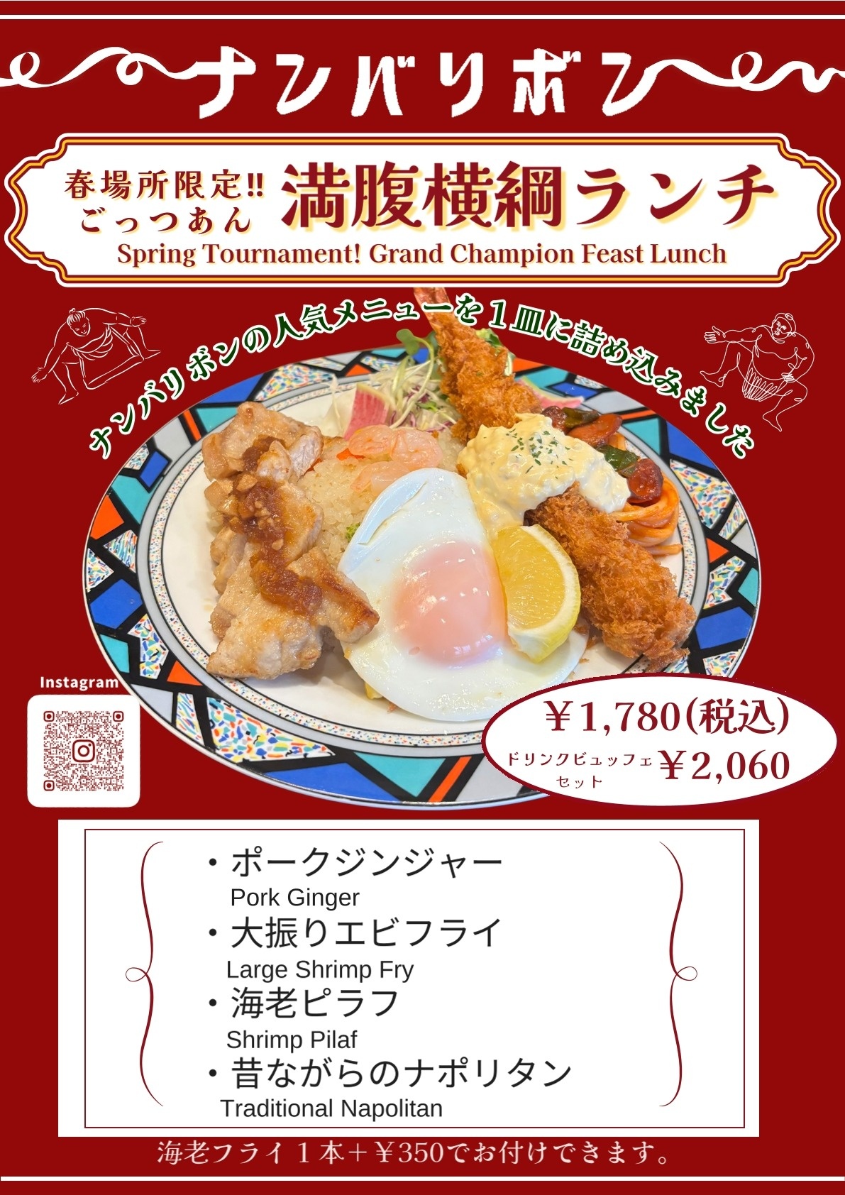 今年は大振りエビフライ、ナポリタン、エビピラフ、ポークジンジャー等人気メニューを一皿に詰め込んだ「満腹横綱ランチ」が登場!