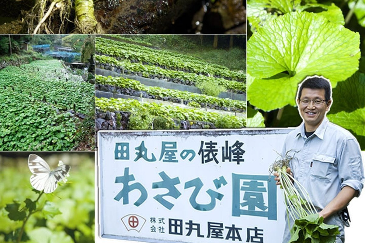 田丸屋本店はワサビ栽培発祥の安倍川上流(安倍奥)と富士山の湧水が流れる富士宮に自社農園をもっていて、扱うワサビはすべて国内産。山の水の養分でじっくり11~18カ月かけて育った、香り、味、鮮度にこだわったワサビを使っています。