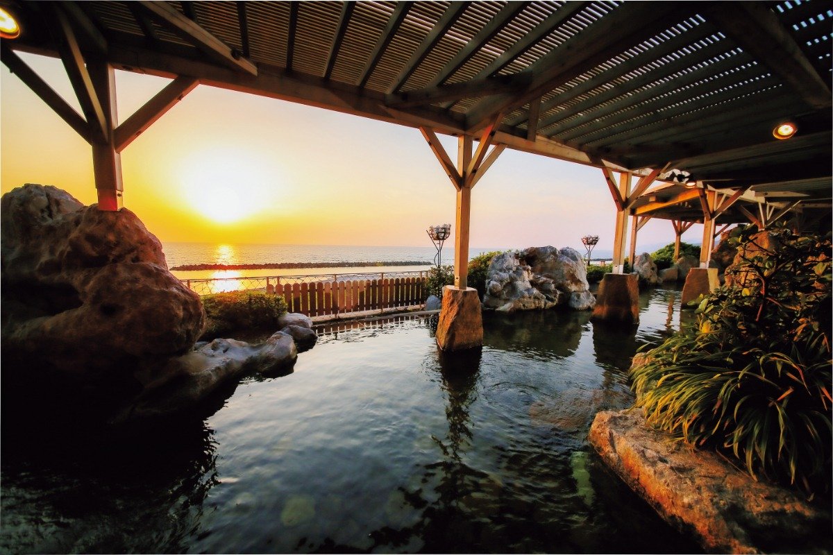 村上市の瀬波温泉。「大観荘 せなみの湯」は、沈む夕日を見ながら湯浴みできます
