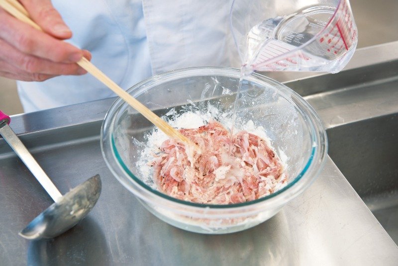 - 3.手順2に、水60mℓを少しずつ入れながら、桜えびを傷めないようにサッとまぜる。