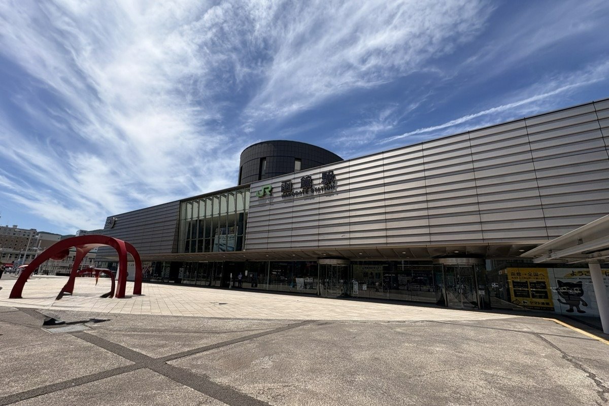 新函館北斗駅や小樽駅、札幌駅を経由して旭川市の旭川駅とを結ぶ函館本線の駅。駅構内に、函館ならではのスイーツ店や道産食材を用いた料理店、「いかめし」などの名物を販売する駅弁店があります。