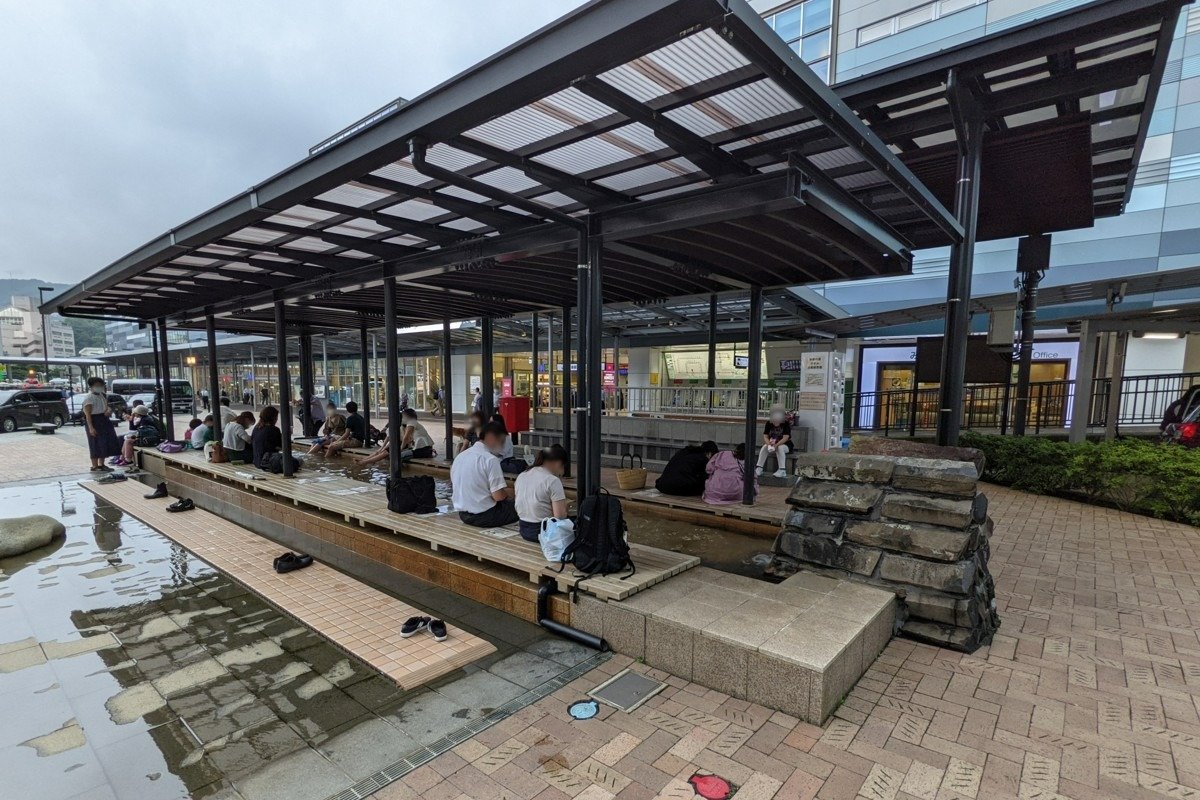 駅ビル「ラスカ熱海」があり、干物やワサビ関連、練り製品など伊豆みやげが揃い、1階に観光案内所もあります。駅前広場には「家康の湯」(足湯)があり、源泉かけ流しの温泉を楽しめます。