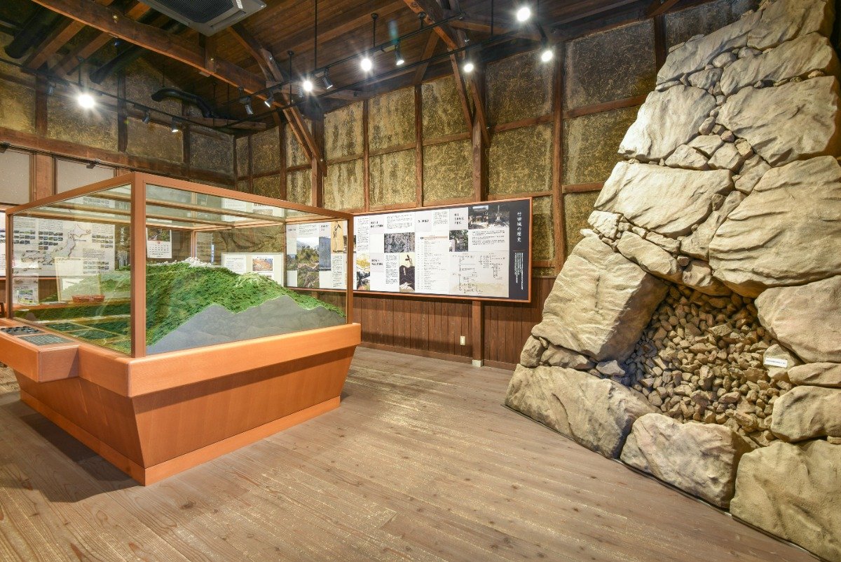 石垣の再現模型や城跡出土遺物などが見られる展示・情報コーナー
