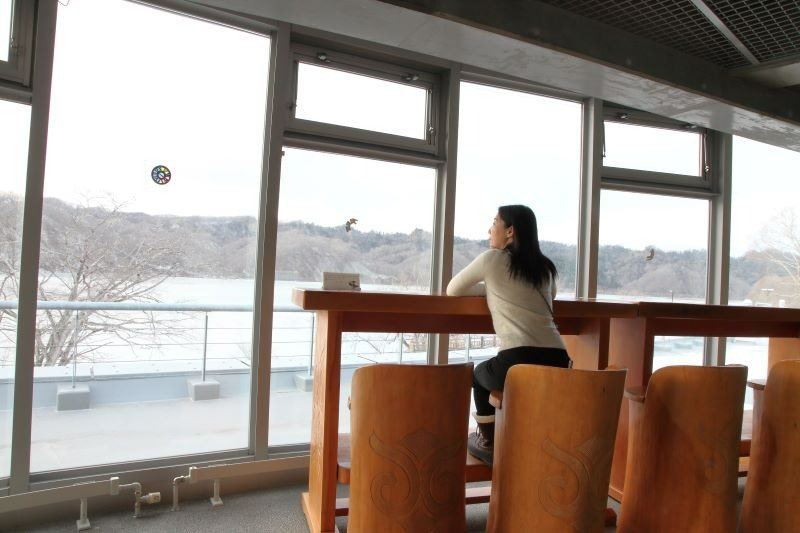 近代の写真や発掘調査の様子の展示を見ながら最上階へ進むと、カウンター席のある展望台ギャラリーに沙流川の景色が広がります。