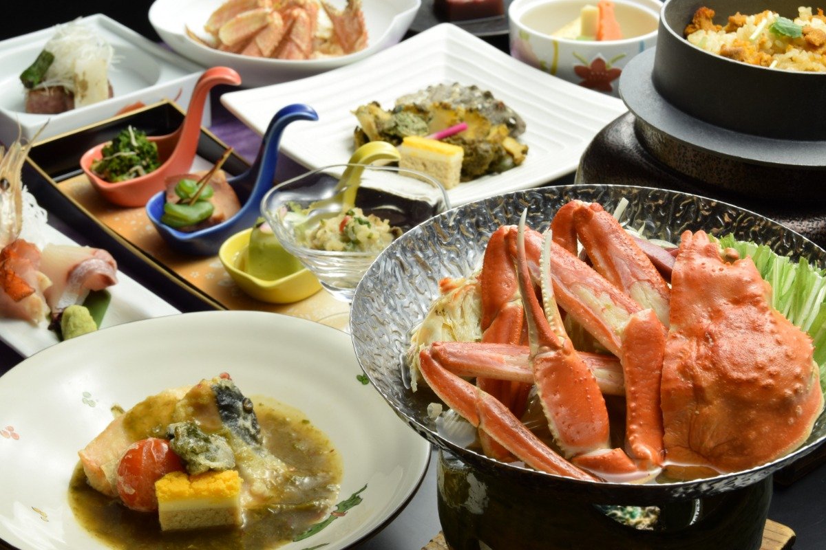 部屋食や食事処で味わう御膳の一例(ズワイガニは5月末頃まで)