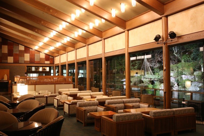 滝のある庭に面したロビーラウンジ「エビアン」