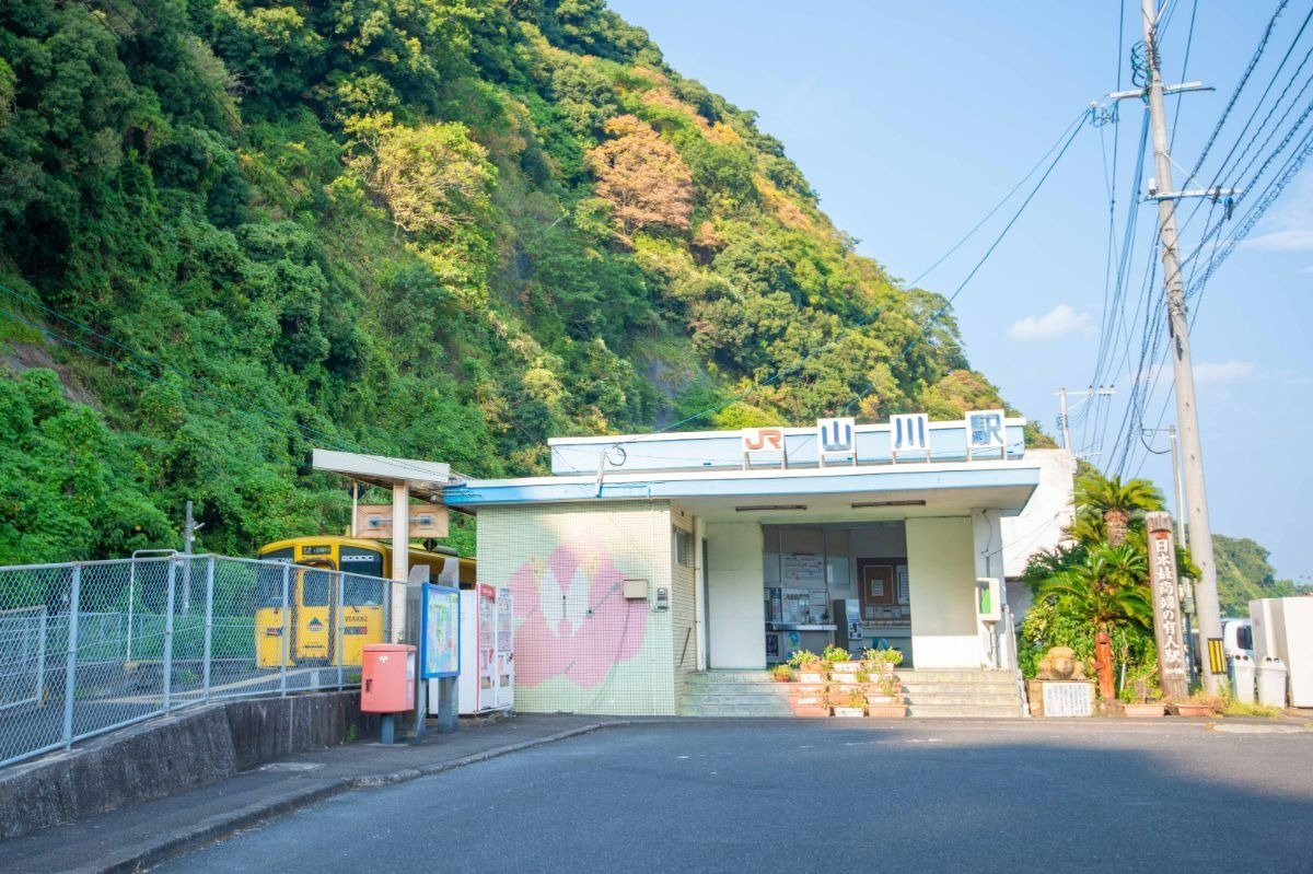 約5700年前の火山噴火で形成された山川湾に面し、断崖を背に立つ駅。鹿児島方面からの列車の多くは山川駅で折り返し、枕崎行きは便数が大幅に減少。枕崎方面へ向かう際はとくに乗り遅れないように気をつけましょう。