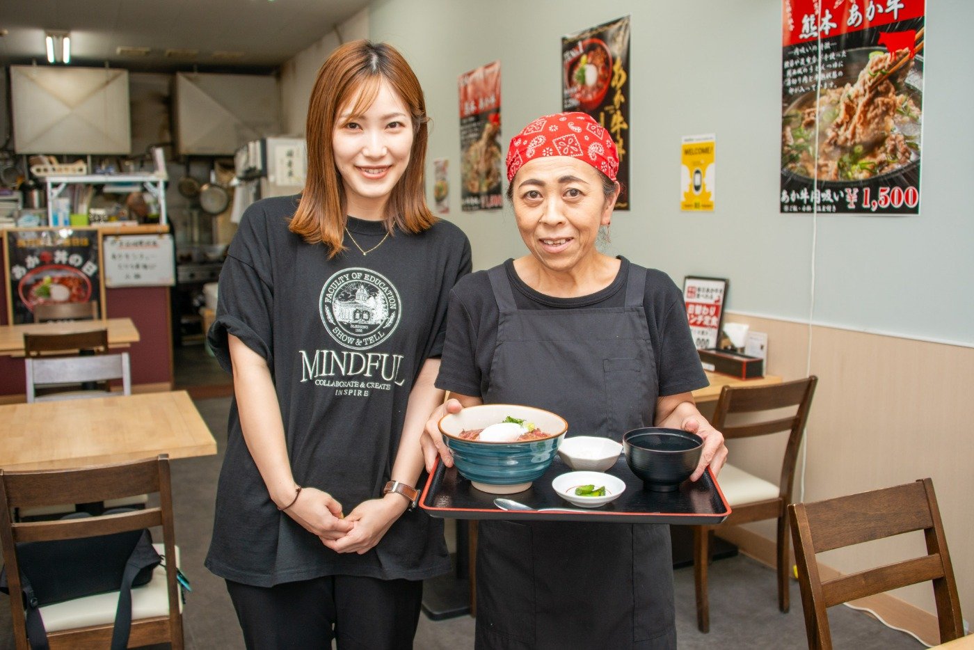 「半数以上のお客さんがオーダーします。まずはそのままあか牛のおいしさを堪能した後、温泉卵や薬味で“味変”をお楽しみください」とお店の方が説明してくれました。お肉を口に運ぶと、赤身と霜降りのバランスが絶妙で、和牛本来の旨みとジューシーさがたまりません! さっぱりとした甘辛ダレが、肉の旨みをより引き立てています。